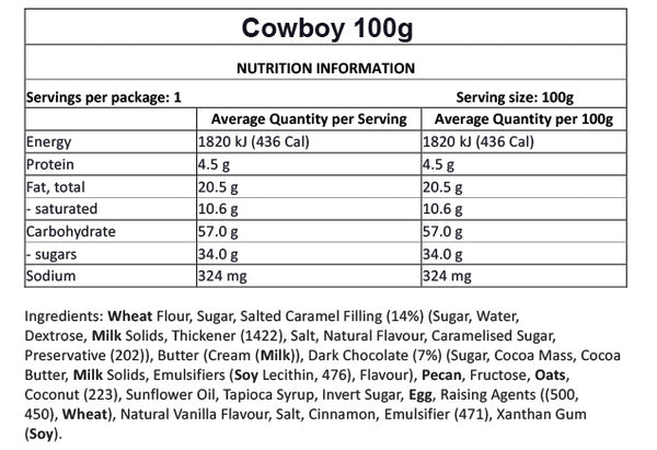 Discover your new go-to indulgence: our Cowboy Cookie packed with dark chocolate, oats, pecans and coconut, finished with a rich salted caramel filling. This bakery-style favourite is bold, hearty and irresistibly indulgent — perfect for those who love deep flavour and satisfying texture in every bite.