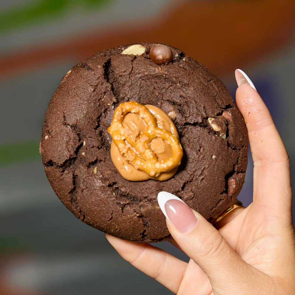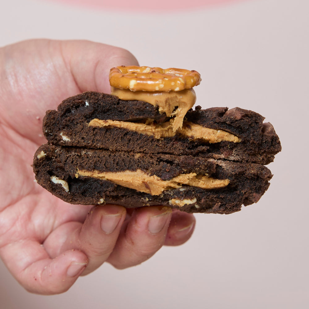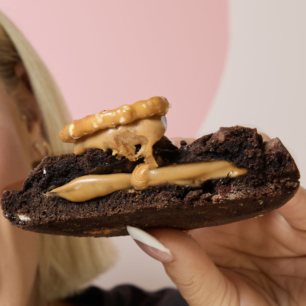 There's enough chocolate and peanut butter in this bad boy to even stop a New Yorker from talking with their mouth full. It will take you more than a New York minute to wade through this Gooey Triple Chocolate Peanut Butter Filled cookie that we've topped with peanut butter and a cheeky pretzel... because, why not?