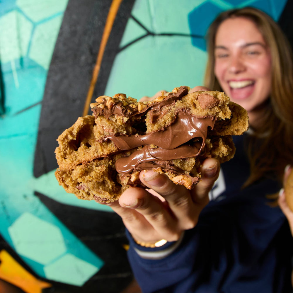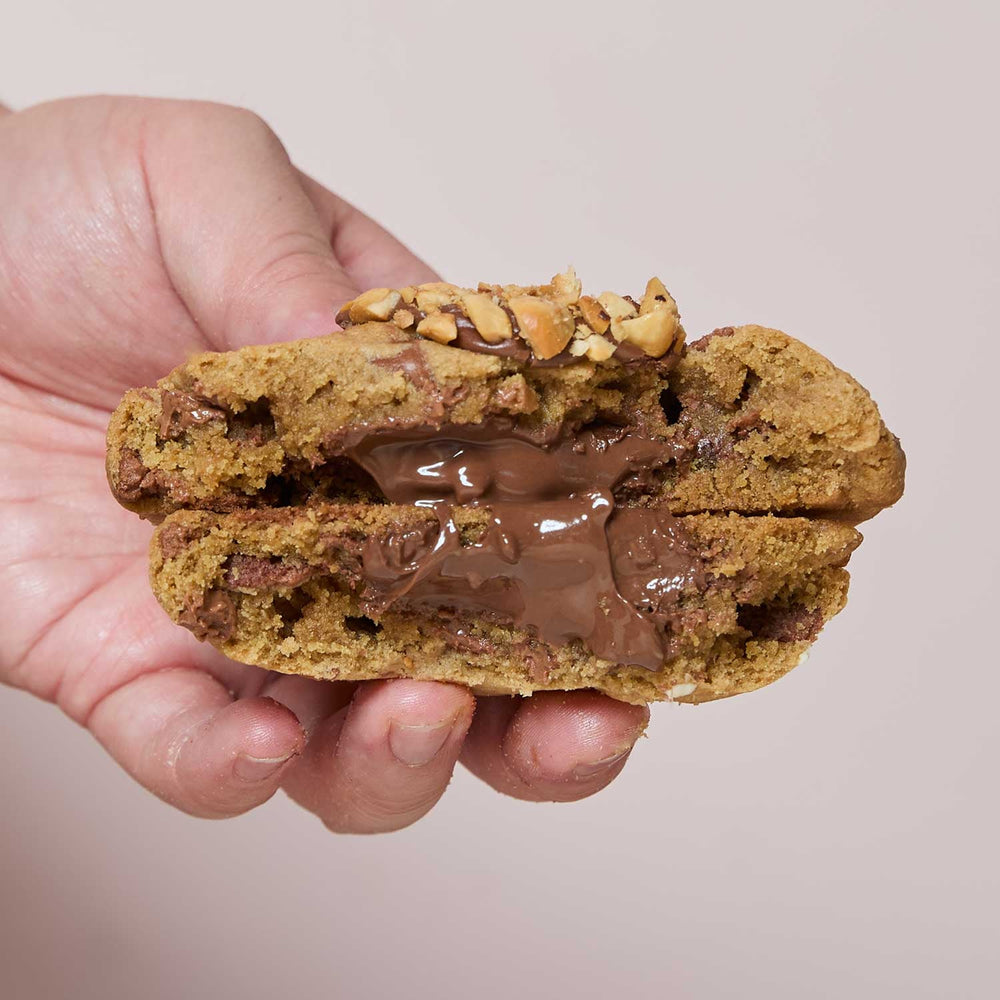 An indulgent take on a classic choc chip cookie, filled with Nutella filling and topped with roasted and crushed hazelnuts. Warning: highly addictive!